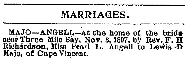 Announcement of the marriage of Lewis Day Majo and Pearl Angell at the Angell family home at Fox Creek, Three Mile Bay, New York on November 3, 1897.
