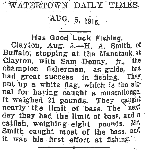 Sam's notoriety quickly spread beyond the small village of Clayton. Details of his guide trips were often highlighted in local papers as customers from around the state and country had their proud moments documented in black and white for all to see. The two newspaper articles below illustrate some of Sam's time on the water. A skiff race winner in June of 1900 and guiding a first-time fisherman during the summer of 1915 to the catch of his life!